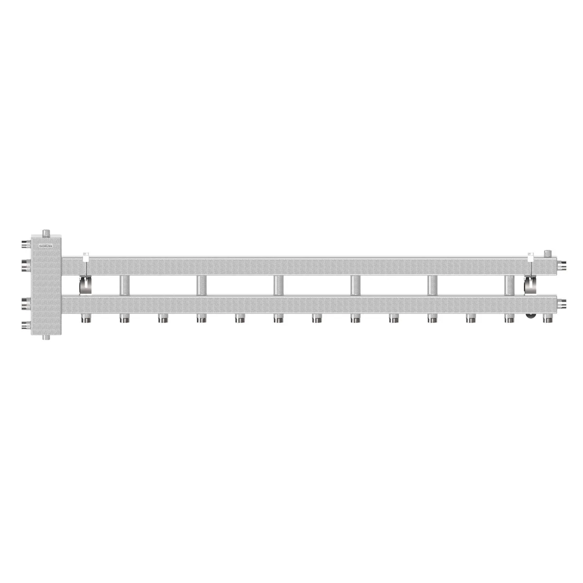 Балансировочный коллектор BM-100-7D (коллектор с гидрострелкой) объединяет в себе функционал гидравлического разделителя и распределительного коллектора на 7 контуров, 6 из которых направлен вниз или вверх (при развороте на 180° по горизонтальной оси) и 1 в сторону.