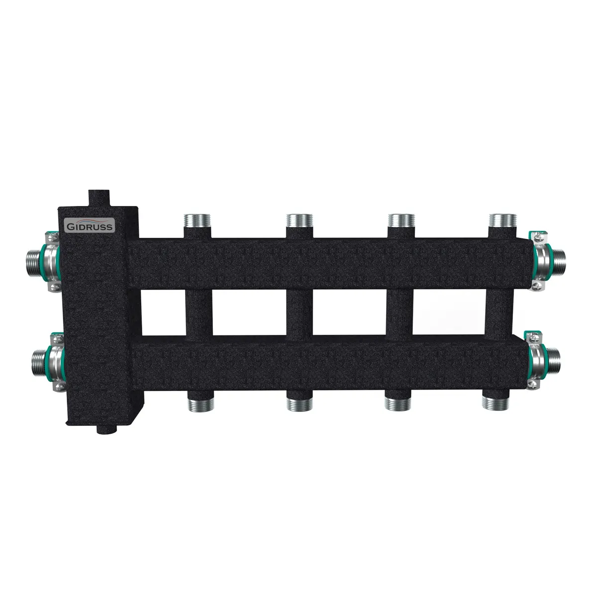 Коллектор с гидрострелкой (балансировочный коллектор) Gidruss BME-60-5DU объединяет в себе функционал гидравлического разделителя для тепло-генераторов мощностью до 60 кВт, а так же распределительный коллектор на 5 контуров G 1'', 2 из которых направлен вниз, 2 вверх и 1 в сторону.