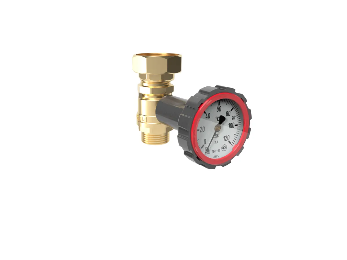Кран c накидной гайкой 1" x 1 1/2" и термометром используется в системах отопления и водоснабжения для перекрытия потока теплоносителя и индикации температуры.