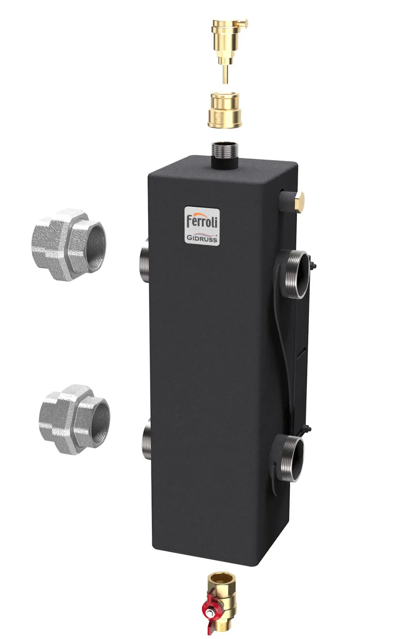 Являясь частью конструктора каскада Ferroli-Gidruss гидравлический разделитель предназначен для корректного подключения к системе отопления на базе двух настенных котлов общей мощностью 200 кВт произвольного количества потребителей с возможностью их работы без взаимного влияния насосов друг на друга для выхода на проектный режим.