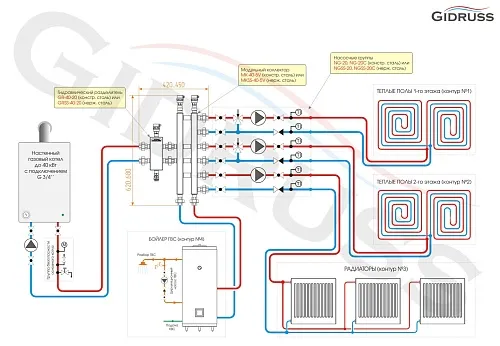 - Для подключения потребителей используйте насосные группы DN25 от Gidruss .