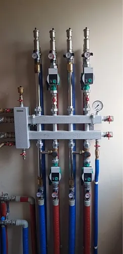 Используется в системе отопления для распределения теплоносителя на четыре контура DN25 подключенных вертикально (2 сверху и 2 снизу) и дополнительным контуром повышенной мощности DN32, подключенным сбоку.