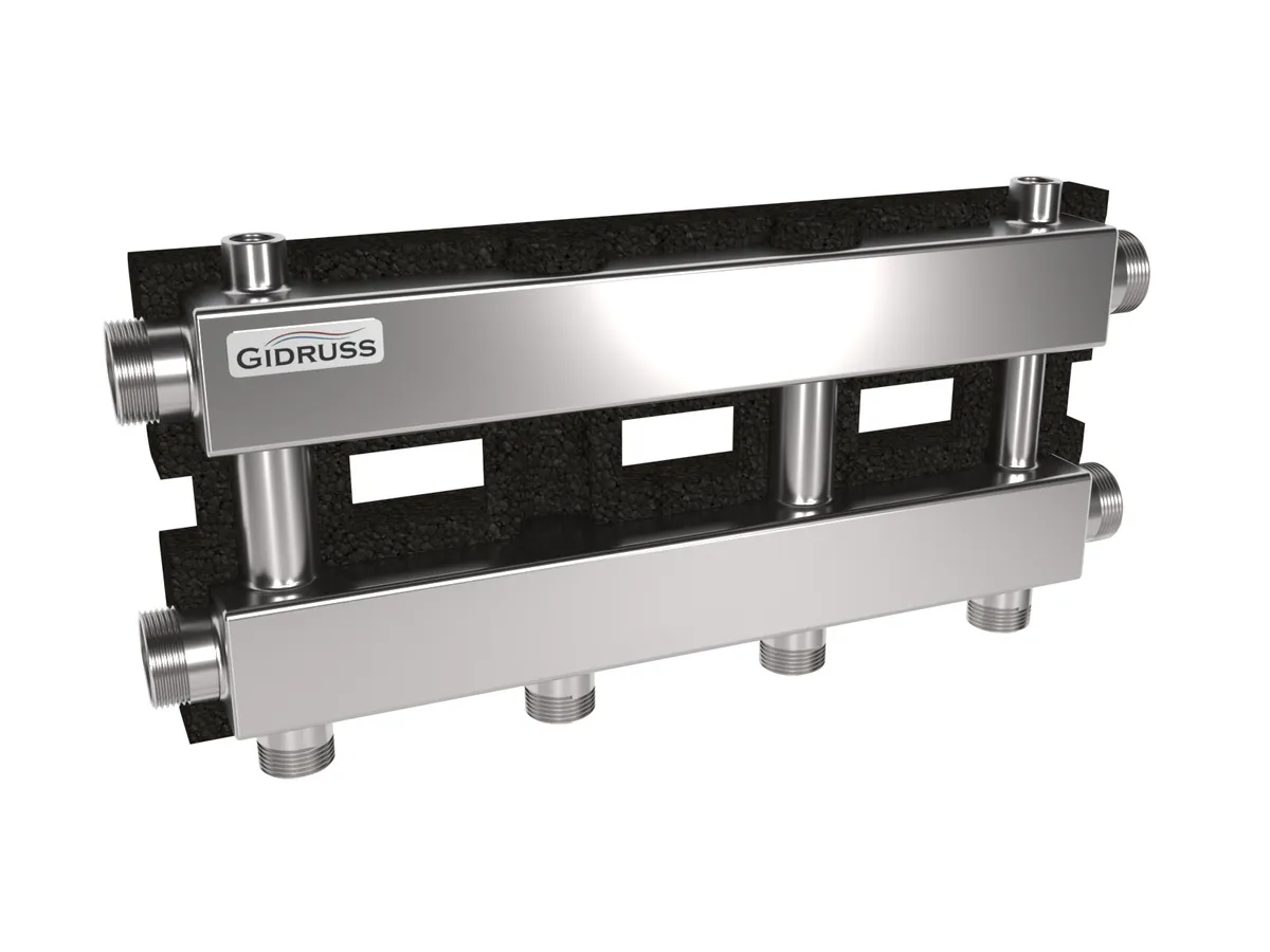 Модульный коллектор отопления нержавеющий с термоизоляцией MKSS-100-2.EPP предназначен для распределения и сбора теплоносителя по 2-м контурам-потребителям G 1″ и одному G ¼″, где подающая и обратная линия каждого контура расположены в одной плоскости с осевым расстоянием 125 мм.