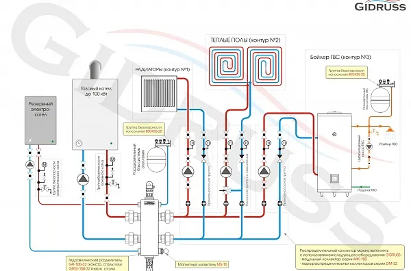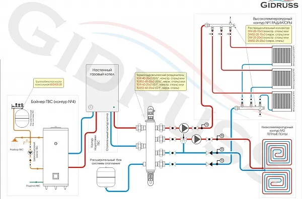 Схема отопления радиаторами и теплым полом с одним настенным котлом