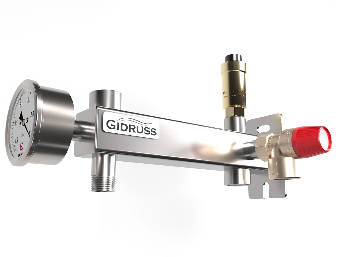 - На фасадном торце группы безопасности имеется подключение Rp ¼ ″ для подключения манометра без лишних переходников.