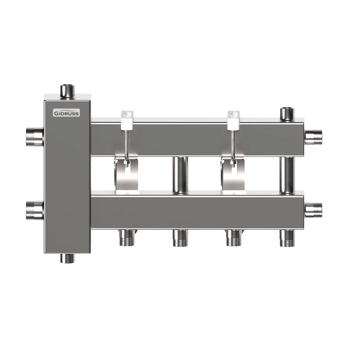 Балансировочный коллектор компактного исполнения BMKSS-60-3D из нержавеющей стали объединяет в себе функционал гидравлического разделителя и распределительного коллектора на 3 контура G ¾'', 2 из которых вверх или вниз и 1 в сторону. Данный коллектор удобен для монтажа в небольших котельных в основном с настенными котлами.