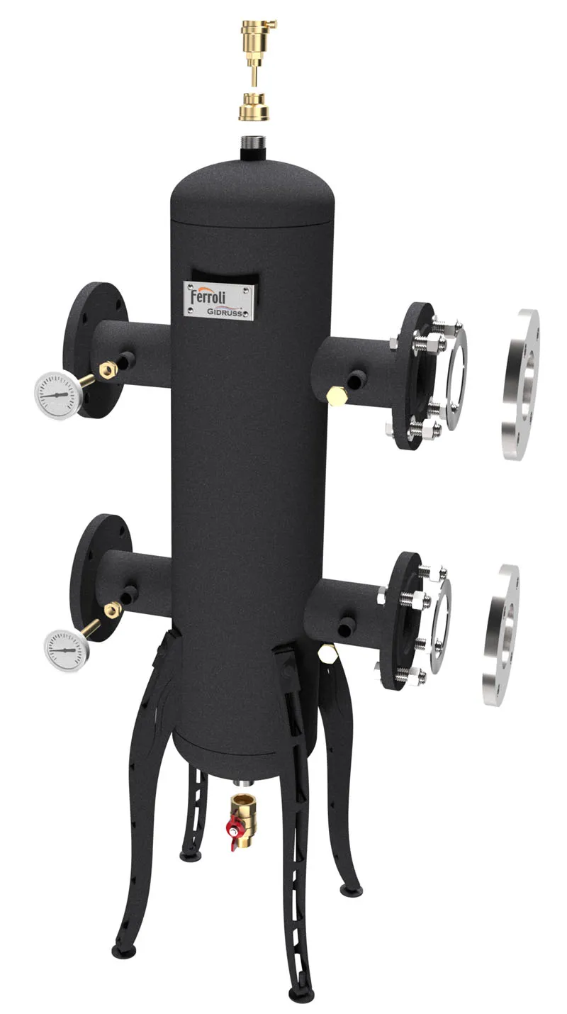 Являясь частью конструктора каскада Ferroli-Gidruss гидравлический разделитель DN80 предназначен для корректного подключения к системе отопления на базе 2-4 настенных котлов общей мощностью 600 кВт произвольного количества потребителей с возможностью их работы без взаимного влияния насосов друг на друга для выхода на проектный режим