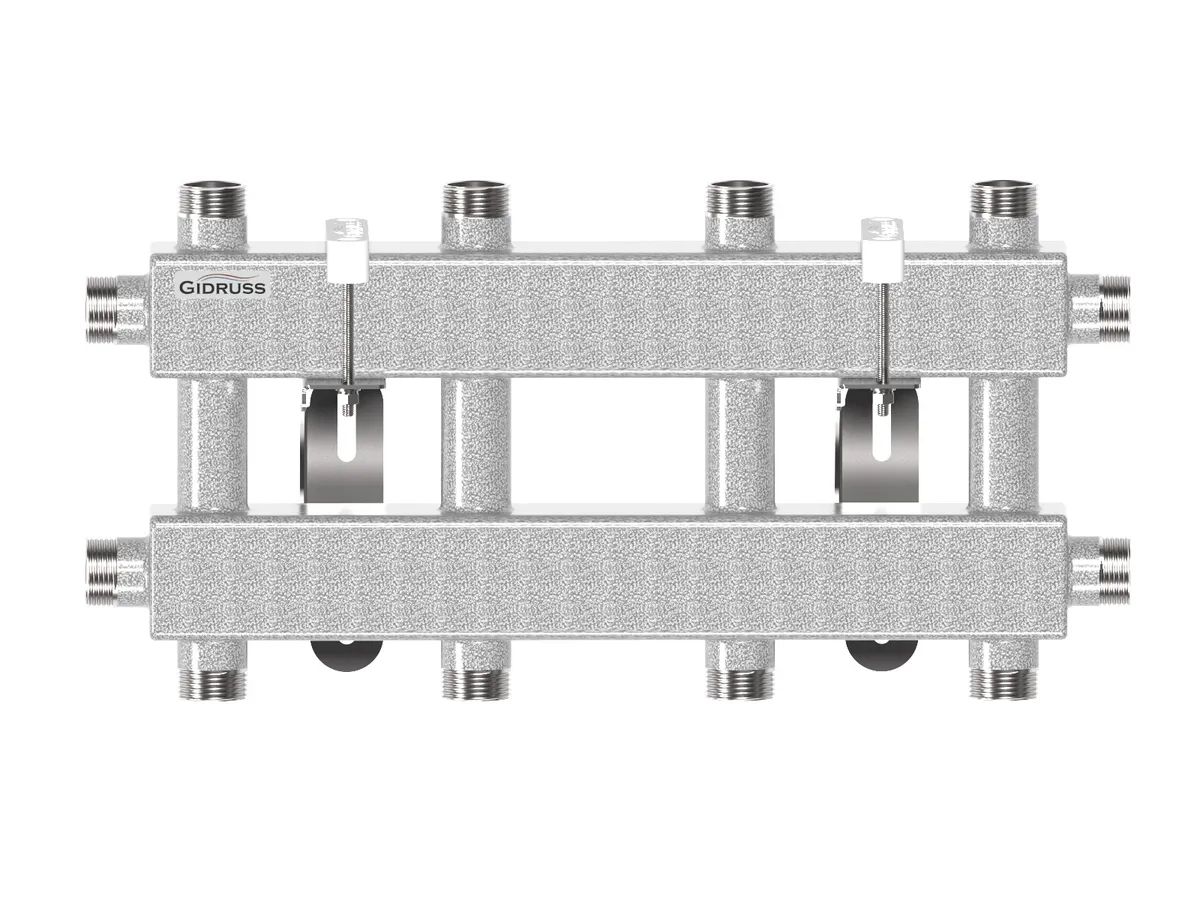 Модульный коллектор Gidruss MK-60-5DU предназначен для распределения теплоносителя по контурам или его сбора в каскад для вывода на гидравлический разделитель, где подающая и обратная линия каждого контура расположены параллельно друг с другом на расстоянии 125 мм. Присодениенительный размер контуров G 1″.