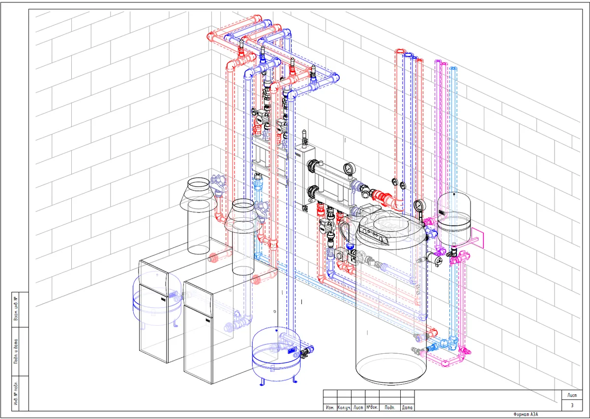 Проект котельной создан на базе 2 котлов SLIM от Baxi и бойлере косвенного нагрева Drazice на 250 литров. Соединяют всю конструкцию в проекте - гидрострелка и 2 коллектора от из конструкционной стали от Gidruss.