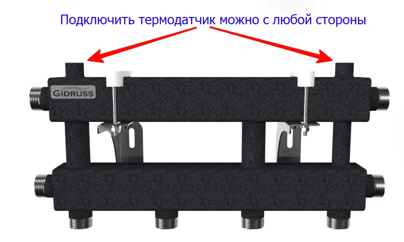 Для этого на корпусе подающего коллектора расположено подключение Rp ½″ для ввинчивания латунной гильзы куда и погружается термо-датчик, при этом низковольтный провод выходит наверх, что намного надежней и безопасней любого бокового подключения.